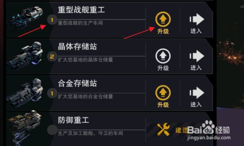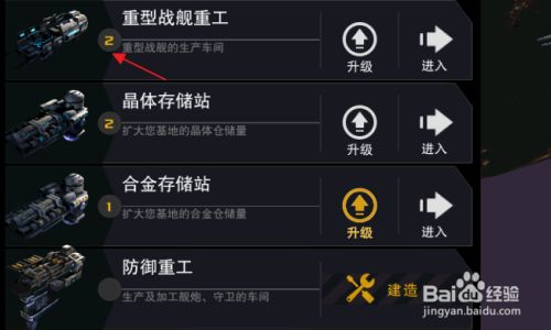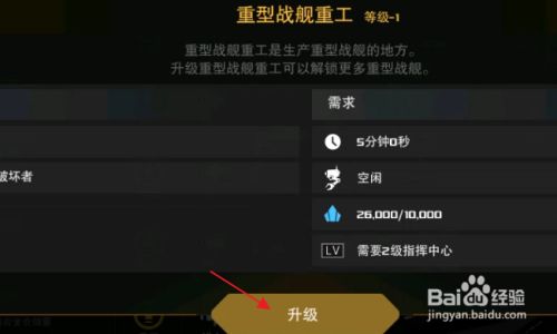 我们就来到建造界面。点击建造界面里的重型战舰重工右方的升级。这里,我们的重型战舰重工等级是1级。