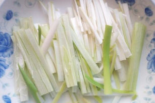 大葱收拾清洗干净,控干水分,切成粗丝。另切少许姜备用。