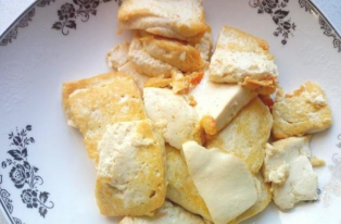 锅里放入油加热,油热后放入豆腐,小火煎塌。煎塌至豆腐表面微黄,盛出备用。