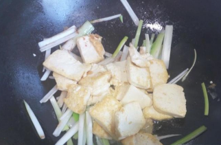 锅里重新放入油加热,油热后放入葱,姜小火翻炒,放入五香粉。翻炒出葱香味后,放入煎塌好的豆腐,中火略翻炒一下。