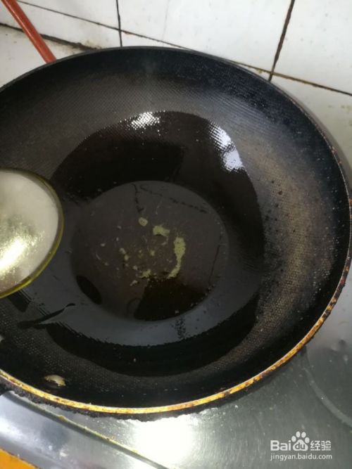 这时,打开燃气灶。把锅内的水分烧干,放入油,量比炒菜多一点。