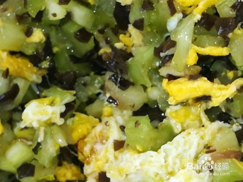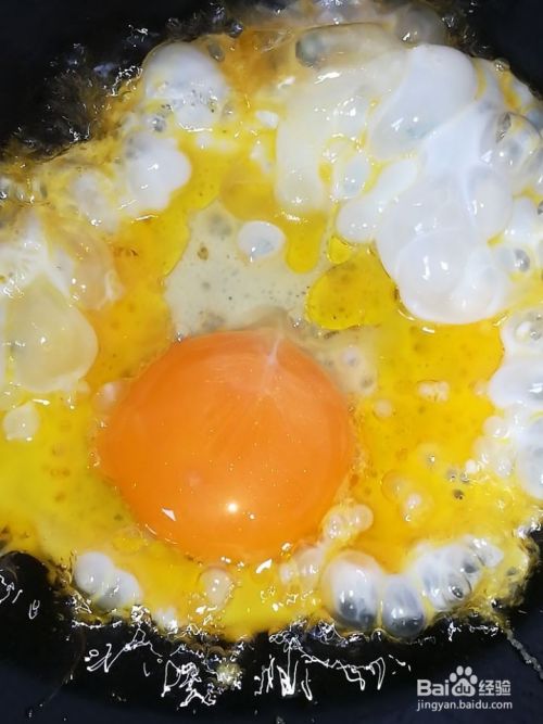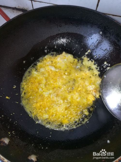 磕进2个鸡蛋,油温不要太高,这样容易把鸡蛋搅碎。搅成碎末奥。