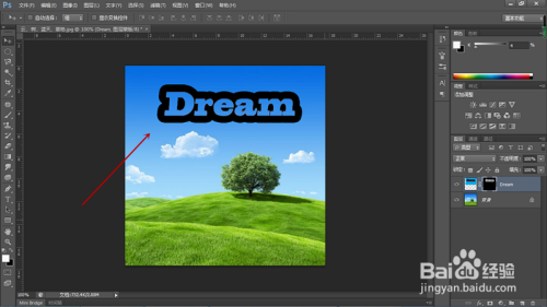 如下图,我们要把字母素材红色部分去掉,只把镂空的黑色边框置入到风景图中。