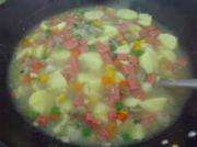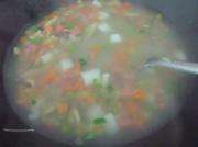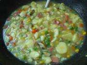 锅里放半汤匙橄榄油,或者葵花油等味道比较浅的食用油。炒香姜末和葱花。倒杂菜炒均匀,兑高汤淹没食材。