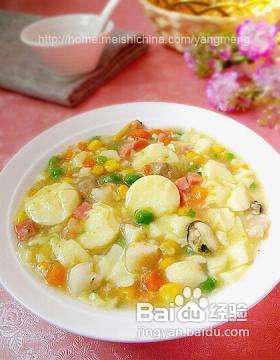 <p>海鲜日本豆腐主料:日本豆腐 五条 什锦杂菜 大半碗 海鲜什锦 半碗 火腿肠 适量 <br>海鲜日本豆腐辅料:姜 适量 葱 适量 水淀粉 适量 盐 适量 白胡椒 适量 高汤 适量 <br></p>