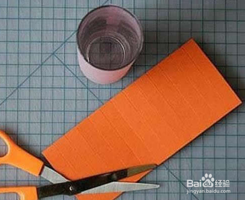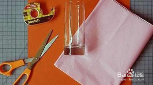 先用双面胶带将白色的纸张粘贴到玻璃杯上面,然后再将黄色的纸张对折,在其对折边缘上进行剪裁。