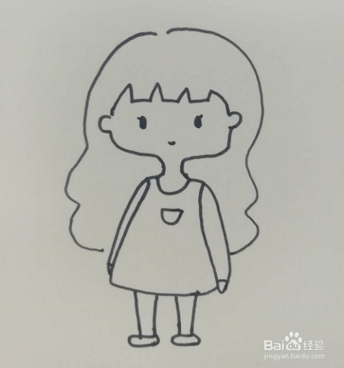 最后一步,就是给小女孩画上眼睛鼻子和嘴巴,裙子上还可以画一个半圆形的小兜作为装饰,具体如下图所示。