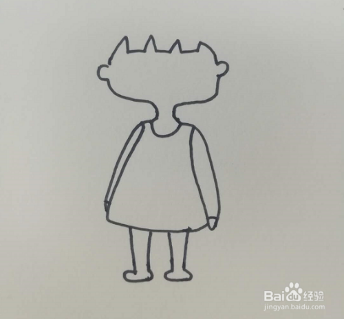 第四步,这一步就是画出小女孩的胳膊和腿,胳膊贴着裙子的两侧,腿的线条也非常简单,具体如下图所示。