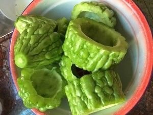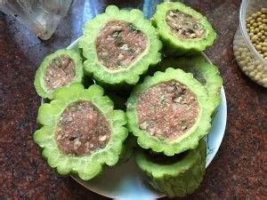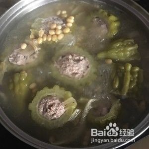 黄豆冷水下去煮,煮至水开下苦瓜肉馅和咸菜,煮至沸腾即可,要是汤不咸可再下点盐,我一般有下咸菜就没有下盐,因为潮汕的咸菜够咸。