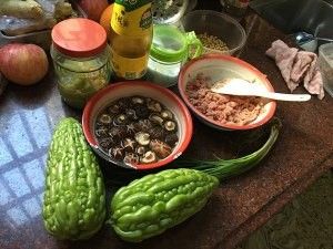 准备苦瓜,肉沫,香菇泡开水,泡开后切成丁,黄豆和咸菜洗净,葱切成粒,起锅烧水下黄豆,黄豆要是没泡过的就冷水下锅先一起煮,有泡过的就等水开了再下。