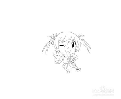 再在身体的下面画出小女孩的两条腿,然后再画出小女孩的两只脚部,这样可爱的小女孩就画好了, 如图所示: