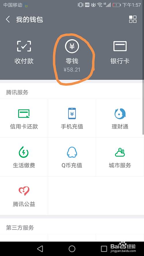 点击钱包以后,有个页面收付款,零钱,银行卡,点击圈起来的“银行卡”