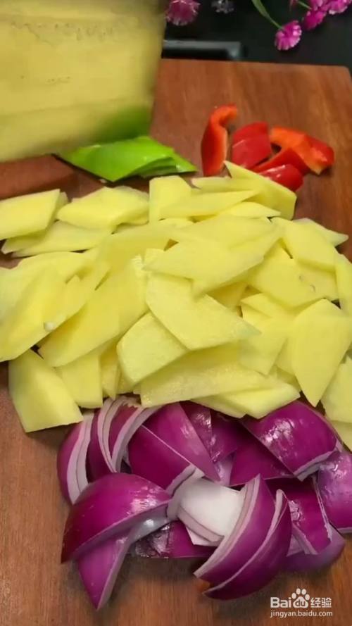 400g土豆去皮切片,两百克圆葱切块,100g青红椒切块,起锅烧水倒入10g盐,倒入土豆片,煮一分钟捞出