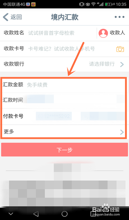 输入完毕后,我们在输入自己的“汇款金额、汇款时间和付款卡号”;