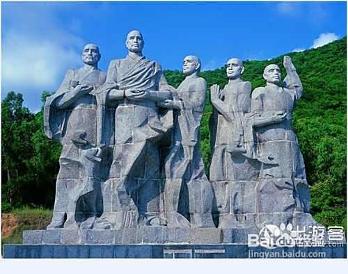 僧。唐天宝元年(公元742)应日本天皇之请赴日本传经,六次渡海,前五次失败。天宝七年(公元748年)六月,鉴真师徒等35人,从扬州启程第五次渡海时遇飓风,漂流万里到振州(三亚市)宁远河口(今大小洞天风景区)一带登岸。在振州居住一年,修造大云寺,传播佛教文化。鉴真赴日本弘法的决心不变,终于在天宝十二年(公元753)六次东渡成功。在日本十年,为促进中日两国文化交流,发展两国人民之间的友谊做出了杰出的贡献,为纪念这一历史壮举,特兴建此巨型群雕。群雕取材鉴真一行第五次渡海漂船着陆的史迹,表现了他们百折不挠的坚强意志、济破沧海的必胜信心和劫难余生的喜悦心情。