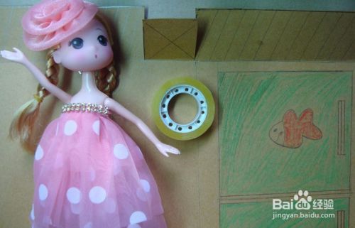 纸盒子用透明胶粘贴好后,这样芭比娃娃的冰箱就做好了。芭比娃娃正在看自己的冰箱,感觉做得很不错。