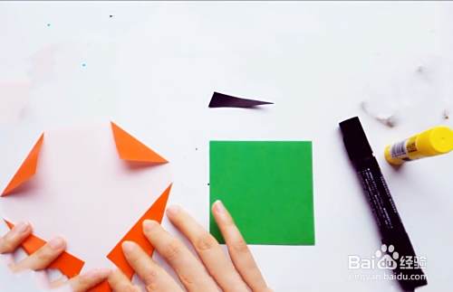 然后将绿色折纸翻转过来,用签字笔画上叶子的脉络形状,如下图所示。
