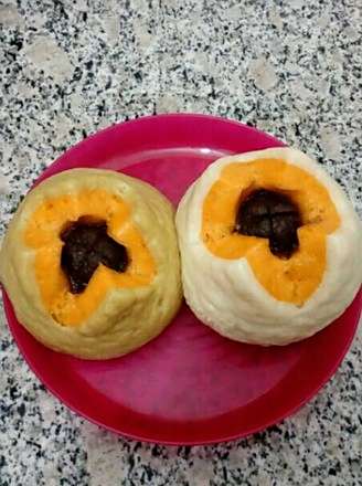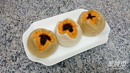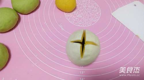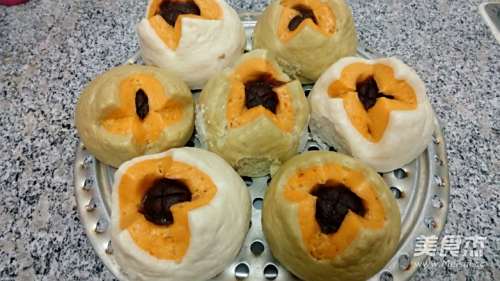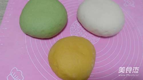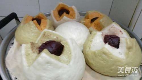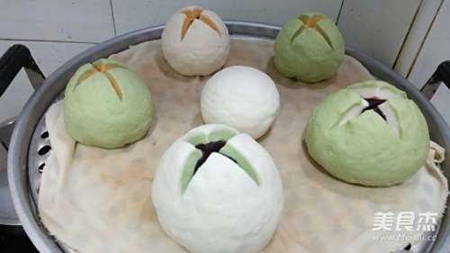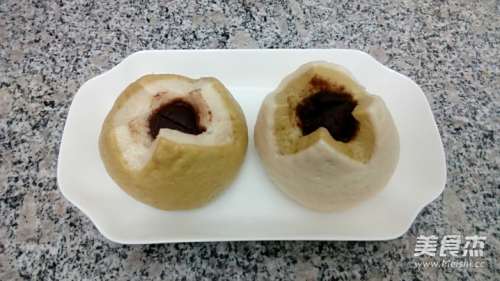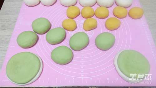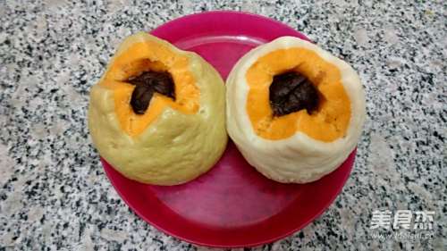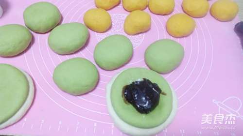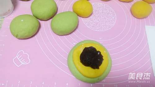 按扁两种颜色的面团上下放好,包入豆沙馅。