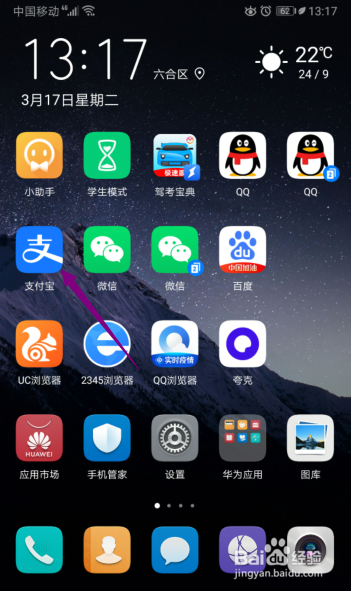 先打开手机,点击支付宝。