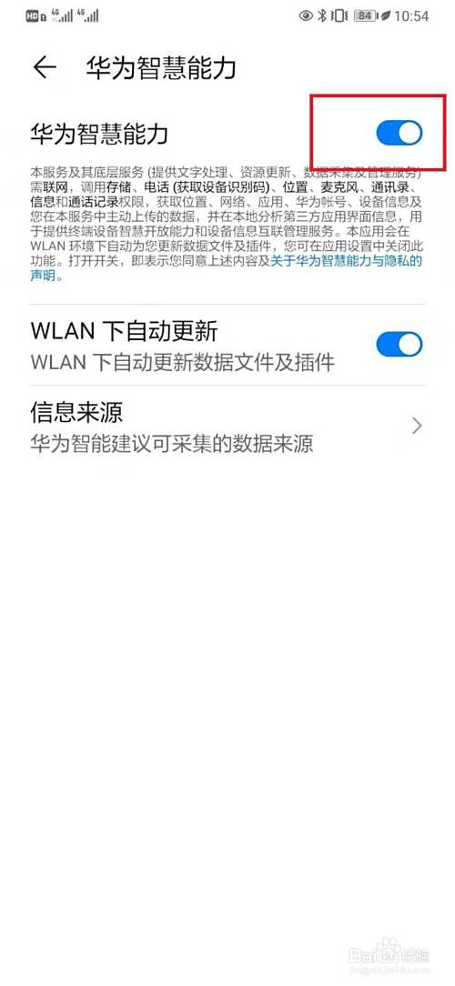 进入华为智慧能力服务设置页面,点击关闭【华为智慧能力】开关,如下图所示。