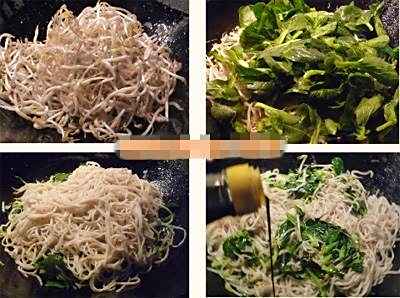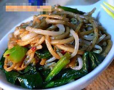 1.油热,葱、姜炝锅后加入绿豆芽炒至稍软