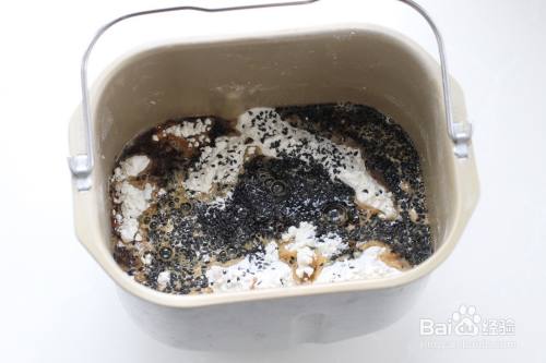 将面粉、泡打粉、酵母、2/3的红枣丁、红糖水、黑芝麻和纯牛奶放进面包桶内。