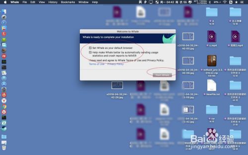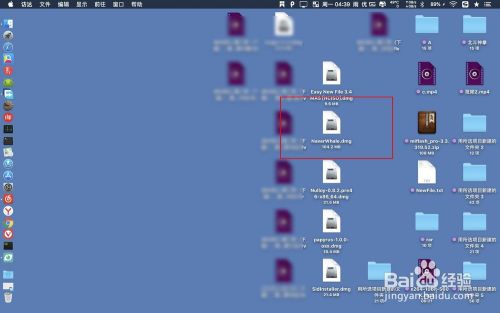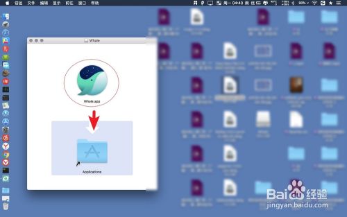 如图先下载dmg文件到达桌面,双击这个文件,把里面的鲸鱼图标拖入到蓝色目录里面。