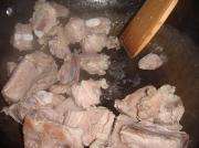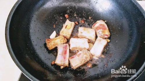 锅烧热,倒入焯过的排骨。这一步是为了控干排骨上的水炒至有香味即可捞起;