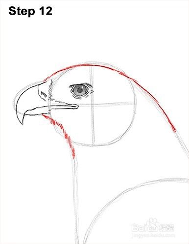 第12步:用最初的圆圈作为引导,画出金鹰头的其余部分。只需按照指南的外部路径并将线条变暗以创建头部的形状即可。当您沿着喙下的指南使用快速,短小的笔画时,可以在脖子上创造羽毛般的纹理。继续将线条比最初的圆圈变暗,以创建颈部以及头部。