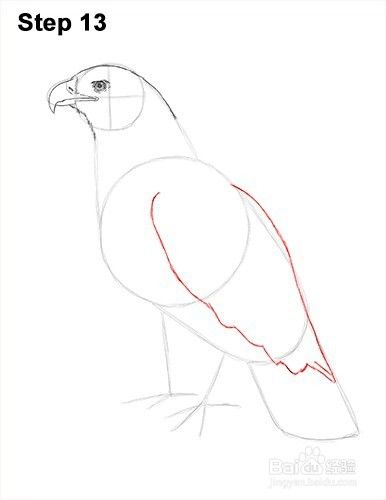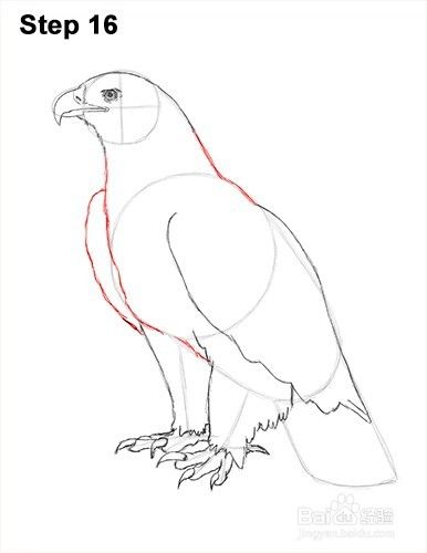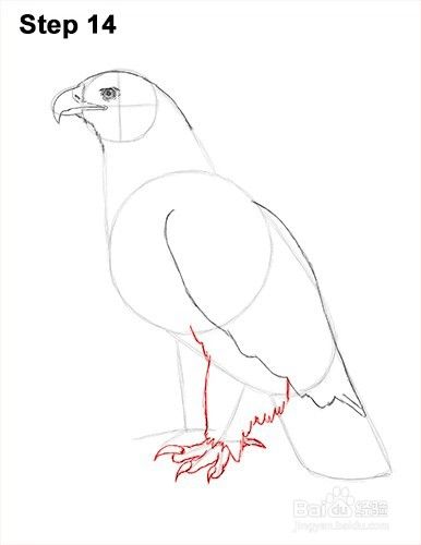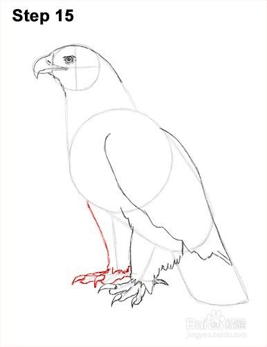 第14步:使用右侧身体下方的线条作为绘制鹰的第一条腿的向导。腿的形状应该在顶部很厚。这条线应该从步骤1的第一个圆圈开始。在底部为羽毛添加几个快速,短的笔触,然后将线条向上和向下弯曲。使用底部较小的线作为指南来绘制单个脚趾和爪。在绘制脚趾周围形状时,请遵循指南的基本路径。使用几条曲线画出爪子。金鹰有巨大的爪,所以不要把它们拉得太小。