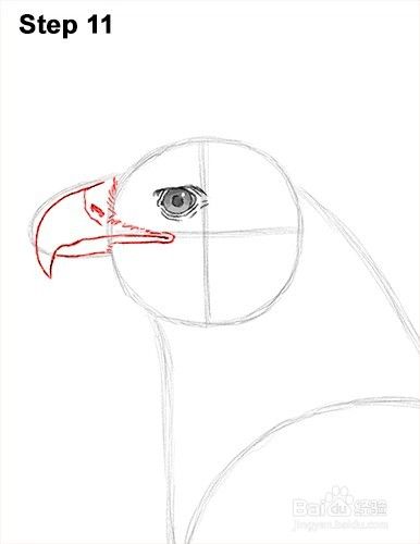 第11步:使用初始弧作为绘制金鹰喙的指南。按照指南的路径,但使喙有点狭窄。继续在初始弧线下方画出喙。画出弧线外的喙钩,并将其嘴巴画成一条延伸至眼睛下方水平构造线的线。