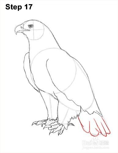 第17步:使用身体右下方的线条作为指引,画出金鹰的尾巴。在导轨内画出一系列长而细的U形弧线来表示单个尾羽。