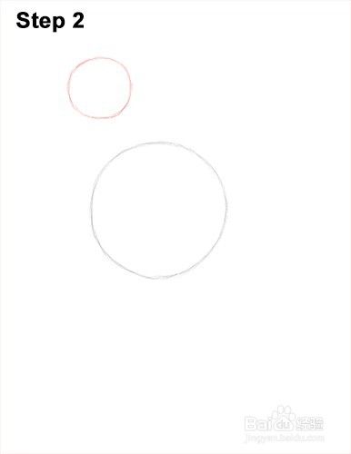 第2步:在顶部,左侧画一个圆圈作为头部的向导。请注意与第一个圆圈相关的圆圈大小。它应该是第一个大小的四分之一。注意两个圆之间的距离。不要把金鹰的头放在离身体太远的地方。
