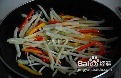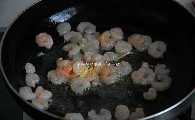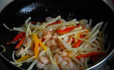 倒入虾仁翻炒均匀放味精淋少许香油(注意银条易熟,不宜炒制过火,要保持它的脆性)
