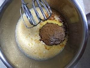4个鸡蛋加105克红糖和2克盐放入干净的搅拌盆,用电动打蛋器开始打发全蛋,打发的过程红糖颜色会越来越浅。