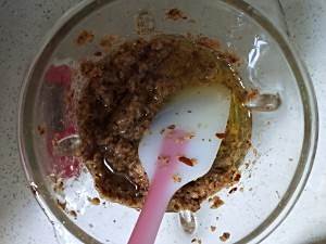 70克去核大枣洗干净,去核后用绞肉机绞碎,也可以用刀切。加入60克牛奶浸泡,直到牛奶全部被吸收,加入80克玉米油,搅拌均匀,放置一边备用