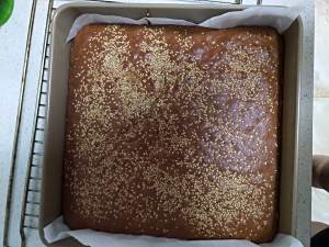 模具垫烘焙纸,面糊倒入模具,轻震出气泡,表面撒白芝麻装饰。