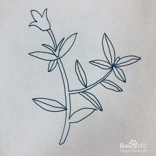 沿着另一根花径绘画出植物的叶子形状哦,如图所示