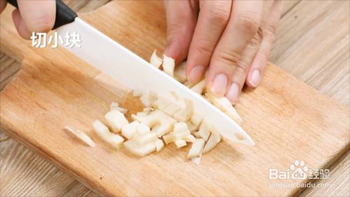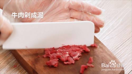 牛肉用刀剁成泥。莲藕去皮切片,再切成小块状。