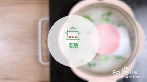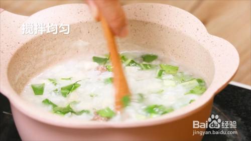 粥煮开后,倒入牛肉泥,青菜碎,莲藕碎煮熟。