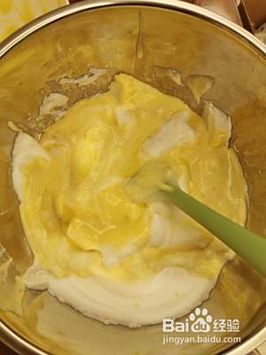 先挖两勺蛋白与蛋黄糊翻拌,然后全部倒回蛋白里,翻拌,不能搅拌。跟炒菜似的那样拌。