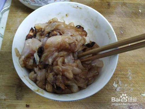鸡肉切条或者切丝,放入碗中,加上盐和大料、酱油,腌制,备用。如下图