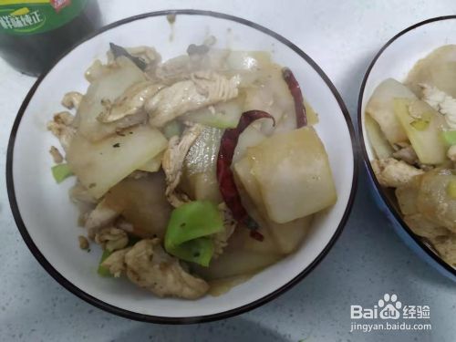 先把鸡肉铲到碗里,然后再开始炒冬瓜,冬瓜炒的差不多了,再放入鸡肉,翻炒。如下图