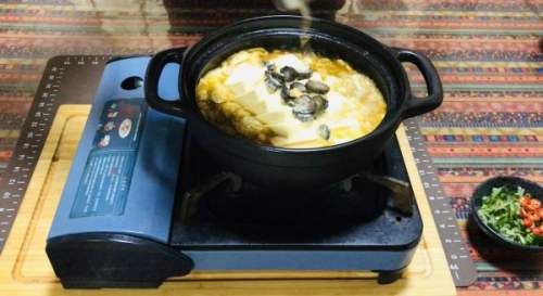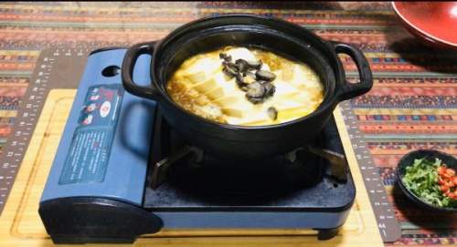 上面摆放好海参片,浇入调好的料汁烧开,用勺子将烧开的料汁从上面多浇几次