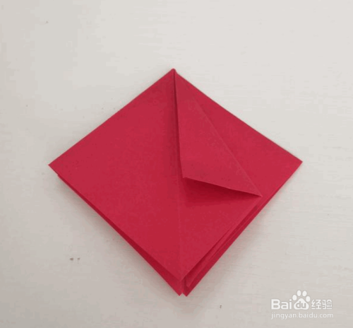 上层左角翻折到右边。再沿着折痕展开为正方形。