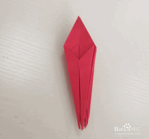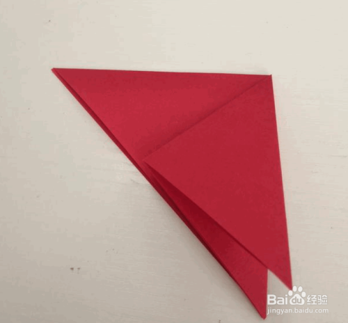把顶角向下翻折后展开,沿着折痕把第一层展开。