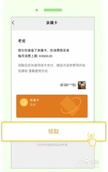 1、当子女赠送亲属卡后,被赠送者手机上会出现如下提示,点击领取。