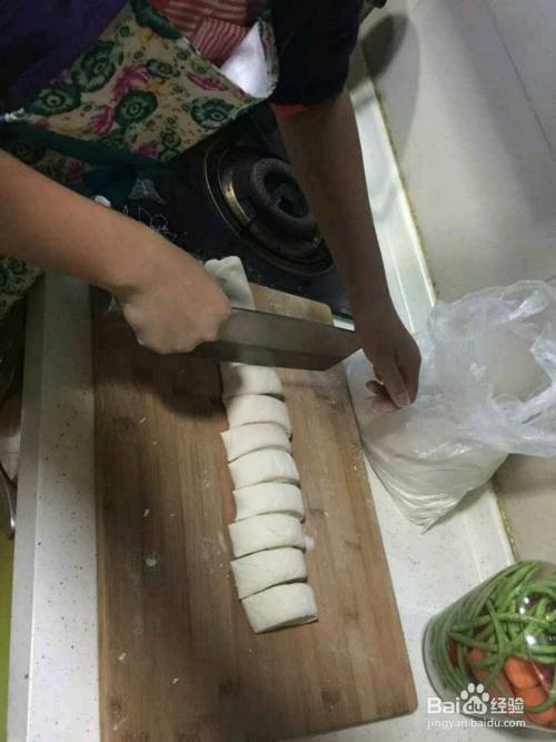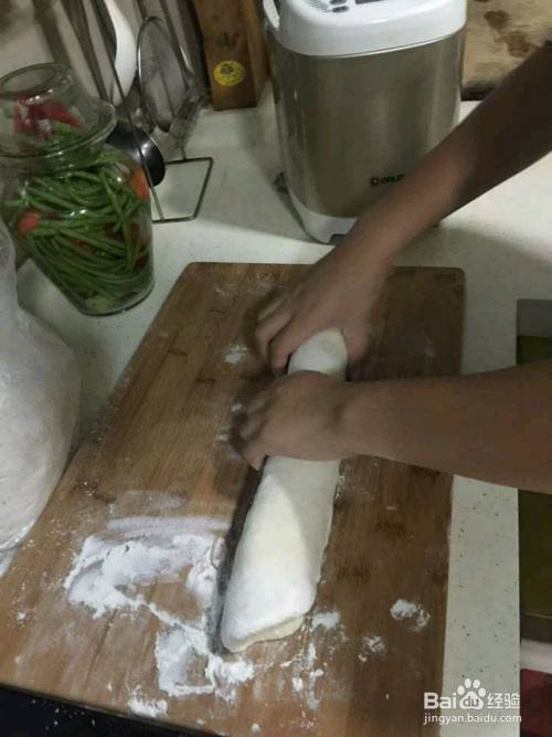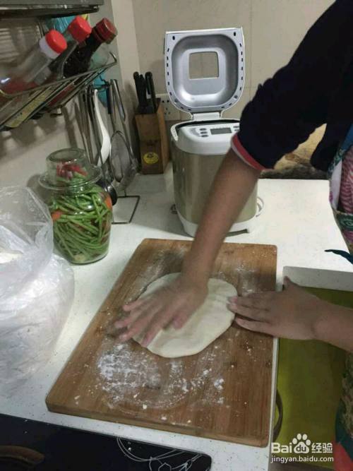 我们把面团取出来,压成饼放气