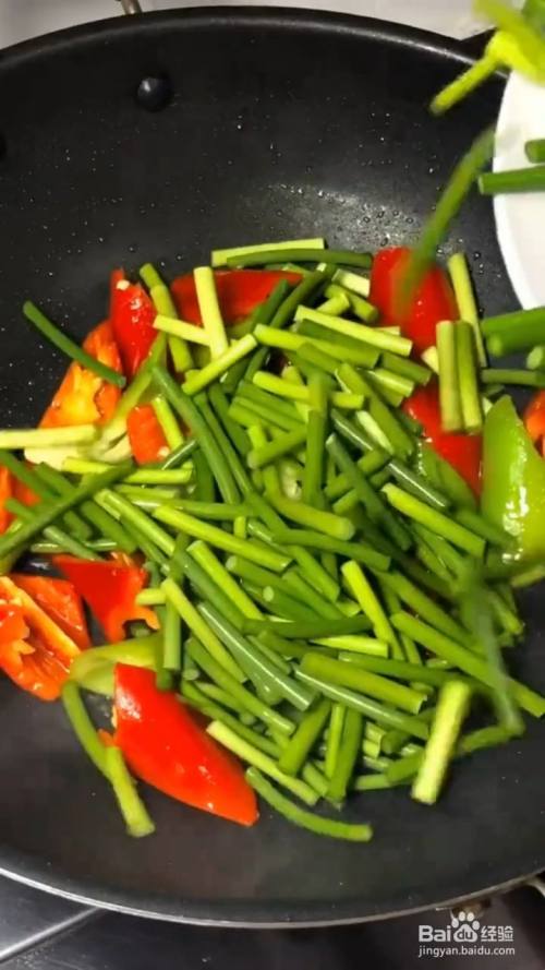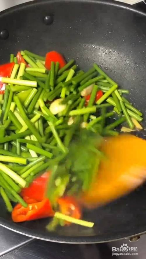 再加入盐 蒜苔翻炒至七成熟盛出备用;
