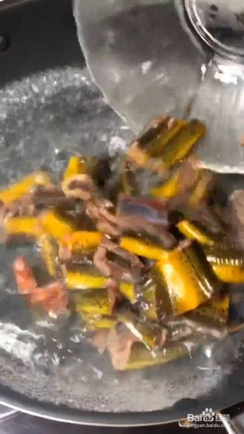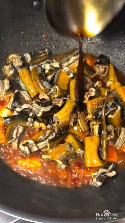 再下入焯好水的鳝鱼翻炒均匀 再加入醋 料酒 生抽炒至断生;